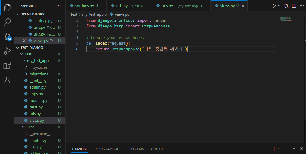 13. my_test_app의 urls에서 전달받은 my_test_app하위의 view.py에서 index함수를 정의해주면 함수는 사용자 요청을 처리한 후, 응답을 돌려준다.