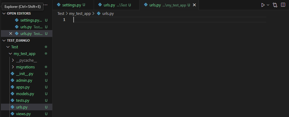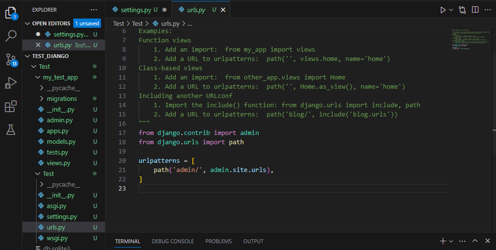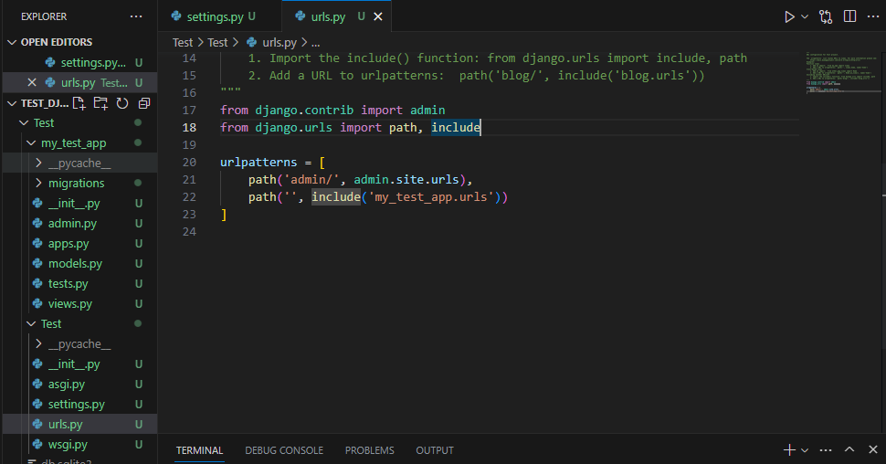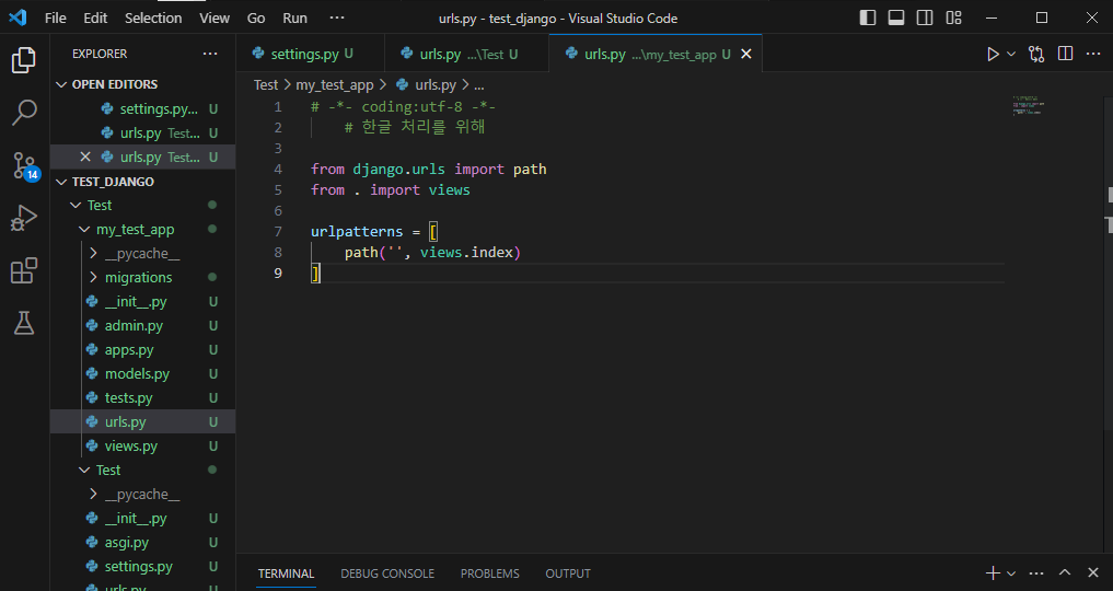 10. 다음과 같이 코드를 작성하여 프로젝트 Test의 urls.py에서 my_test_app의 urls로 사용자 요청을 전달한다.